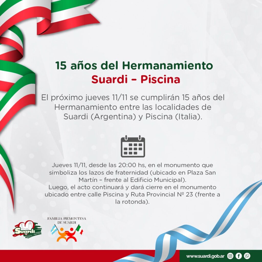 El próximo jueves 11/11 se cumplirán 15 años del Hermanamiento entre las localidades de Suardi (Argentina) y Piscina (Italia).
