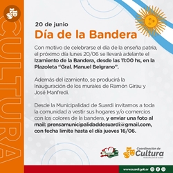 Desde la Municipalidad de Suardi invitamos a toda la comunidad a vestir sus hogares y/o comercios con los colores de la bandera, y enviar una foto al mail: prensamunicipalidaddesuardi@gmail.com, con fecha límite hasta el día jueves 16/06.