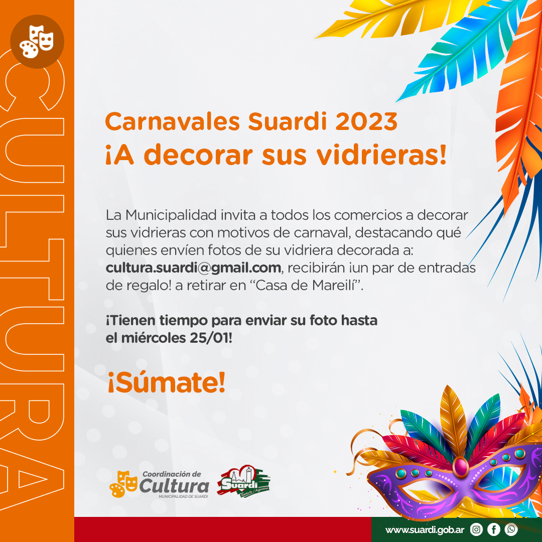 Es por esto, que la Municipalidad invita a todos los comercios a decorar sus vidrieras con motivos de carnaval, destacando qué quienes envíen fotos de su vidriera decorada a: cultura.suardi@gmail.com, recibirán ¡un par de entradas de regalo! a retirar en “Casa de Mareilí”. 🎟️🙌🏻
