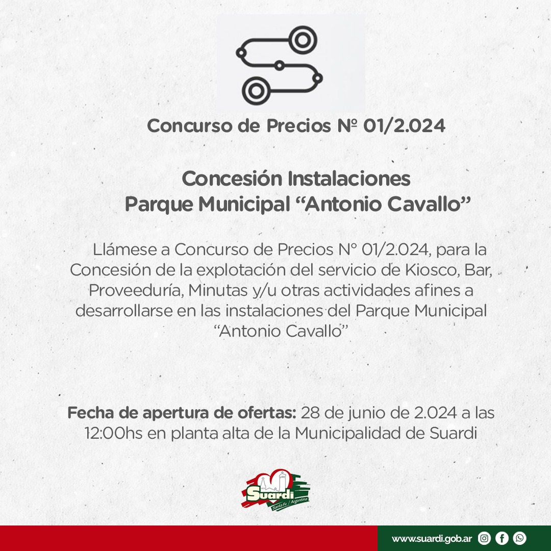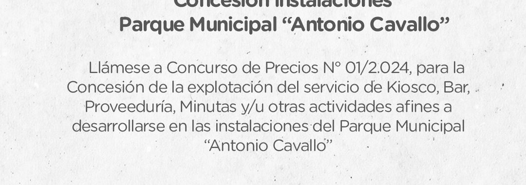 Llámese a Concurso de Precios N° 01/2.024, para la Concesión de la explotación del servicio de Kiosco, Bar, Proveeduría, Minutas y/u otras actividades afines a desarrollarse en las instalaciones del Parque Municipal “Antonio Cavallo”.