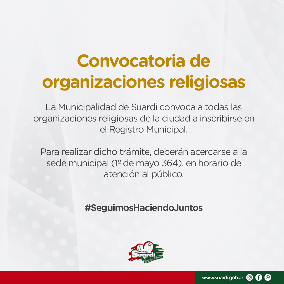 Convocatoria de organizaciones religiosas Publicado el 2 marzo, 20232 marzo, 2023 por Prensa Municipalidad La Municipalidad de Suardi convoca a todas las organizaciones religiosas de la ciudad a inscribirse en el Registro Municipal. Para realizar dicho trámite, deberán acercarse a la sede municipal (1º de mayo 364), en horario de atención al público. Publicado en General, Prensa y etiquetado religión.