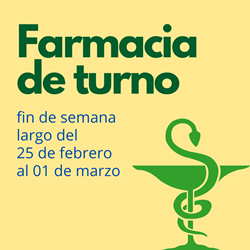 Farmacias de turno – 25, 26, 27, 28 de febrero y 01 de marzo Publicado el 23 febrero, 202224 febrero, 2022 por c2190167 Publicado en Farmacia de turno y etiquetado Farmacia.