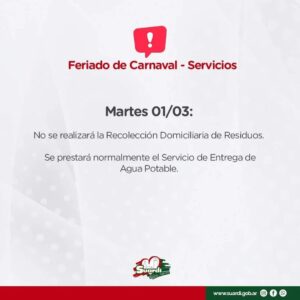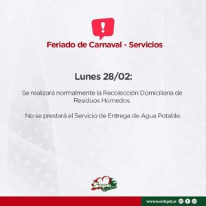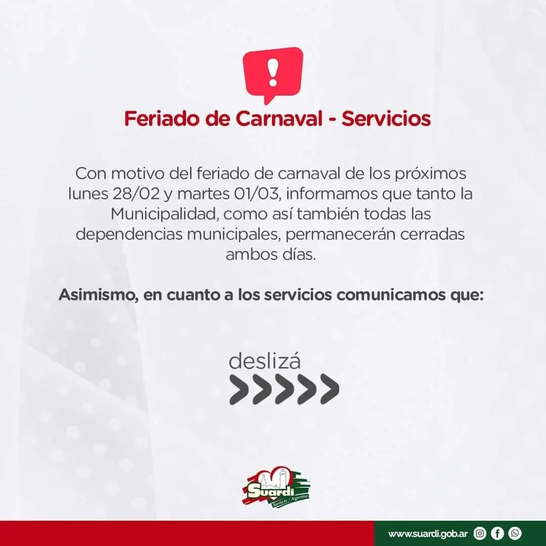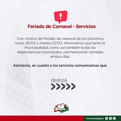 Con motivo del feriado de carnaval de los próximos lunes 28/02 y martes 01/03, informamos que tanto la Municipalidad, como así también todas las dependencias municipales, permanecerán cerradas ambos días.