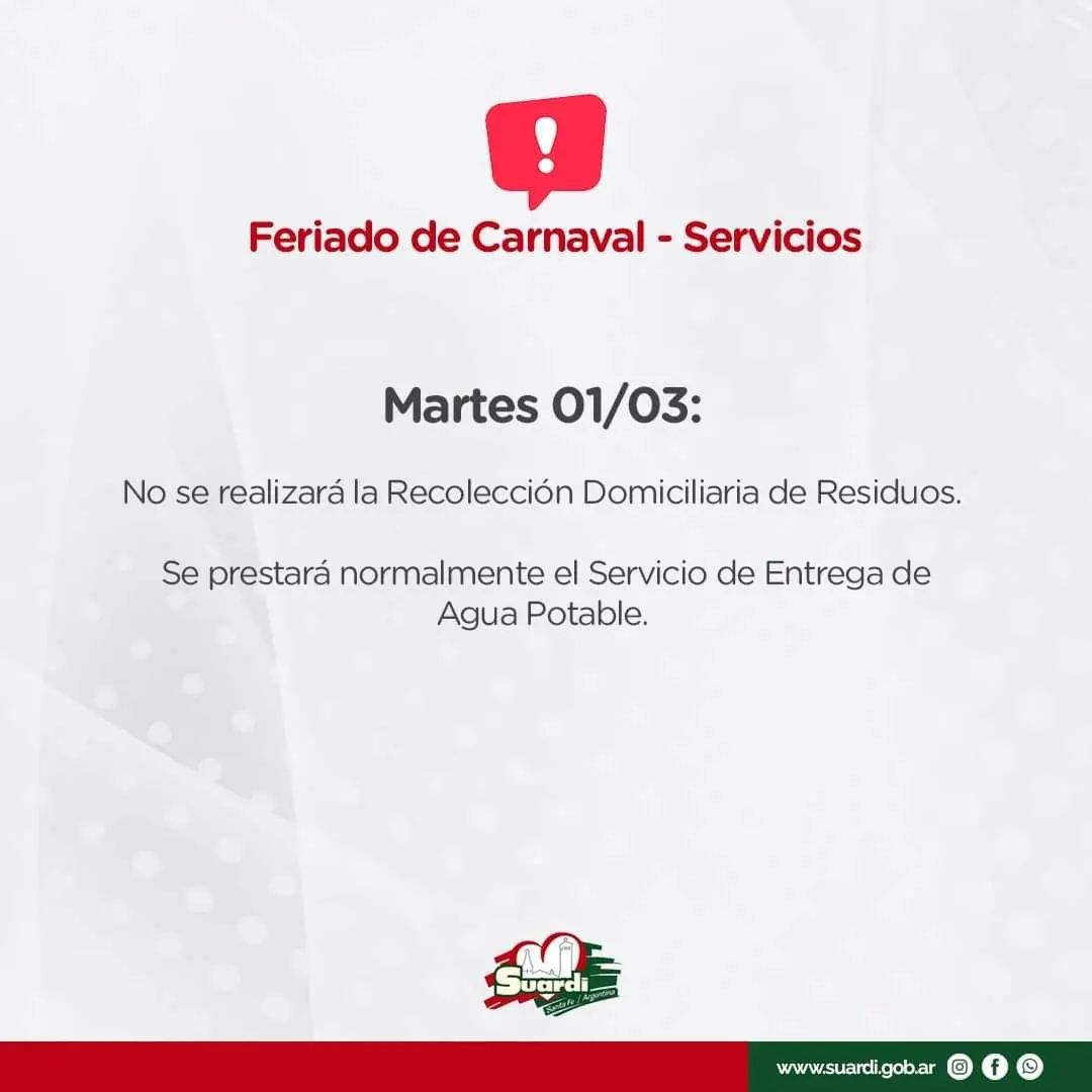 Con motivo del feriado de carnaval de los próximos lunes 28/02 y martes 01/03, informamos que tanto la Municipalidad, como así también todas las dependencias municipales, permanecerán cerradas ambos días.