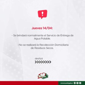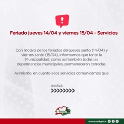 Con motivo de los feriados del jueves santo (14/04) y viernes santo (15/04), informamos que tanto la Municipalidad, como así también todas las dependencias municipales, permanecerán cerradas.