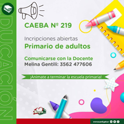 Informamos a toda la comunidad que se encuentran abiertas las inscripciones en el Centro de Alfabetización y Educación Básica para Adultos (CAEBA) Nº 219 para el ciclo lectivo 2023.