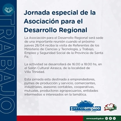 La Asociación para el Desarrollo Regional será sede de una importante reunión cuando el próximo jueves 28/04 reciba la visita de Referentes de los Ministerio de Ciencias y Tecnología, y Trabajo, Empleo y Seguridad Social de la Provincia de Santa Fe.