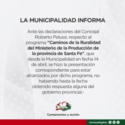 Ante las declaraciones públicas del Concejal Roberto Pelussi, respecto al programa «Caminos de la Ruralidad» del Ministerio de la Producción de la Provincia de Santa Fe, que desde la Municipalidad en fecha 14 de abril, se hizo la presentación correspondiente para estar alcanzados por dicho programa, no habiendo hasta la fecha obtenido respuesta alguna del Gobierno Provincial.-