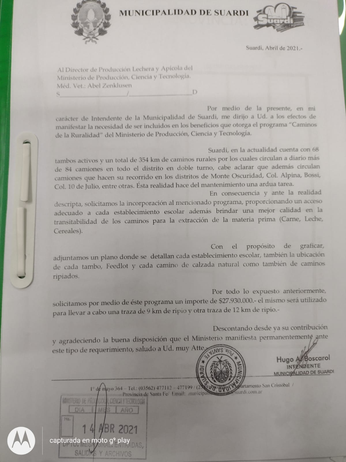 Ante las declaraciones públicas del Concejal Roberto Pelussi, respecto al programa «Caminos de la Ruralidad» del Ministerio de la Producción de la Provincia de Santa Fe, que desde la Municipalidad en fecha 14 de abril, se hizo la presentación correspondiente para estar alcanzados por dicho programa, no habiendo hasta la fecha obtenido respuesta alguna del Gobierno Provincial.-
