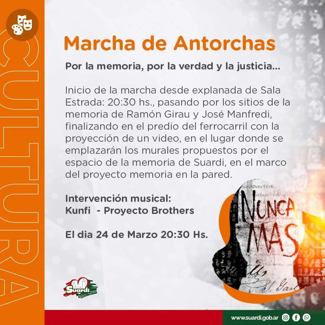 Lugar: La marcha partirá desde la explanada de Sala Estrada, pasará por los sitios de la memoria de Ramón Girau y José Manfredi, y finalizará en el Predio del Ferrocarril, con la proyección de un vídeo, en el lugar donde se emplazarán los murales propuestos por el «Espacio de la Memoria» de Suardi, en el marco del Proyecto: «Memoria en la pared».