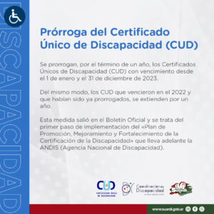 Se prorrogan, por el término de un año, los Certificados Únicos de Discapacidad (CUD) con vencimiento desde el 1 de enero y el 31 de diciembre de 2023.