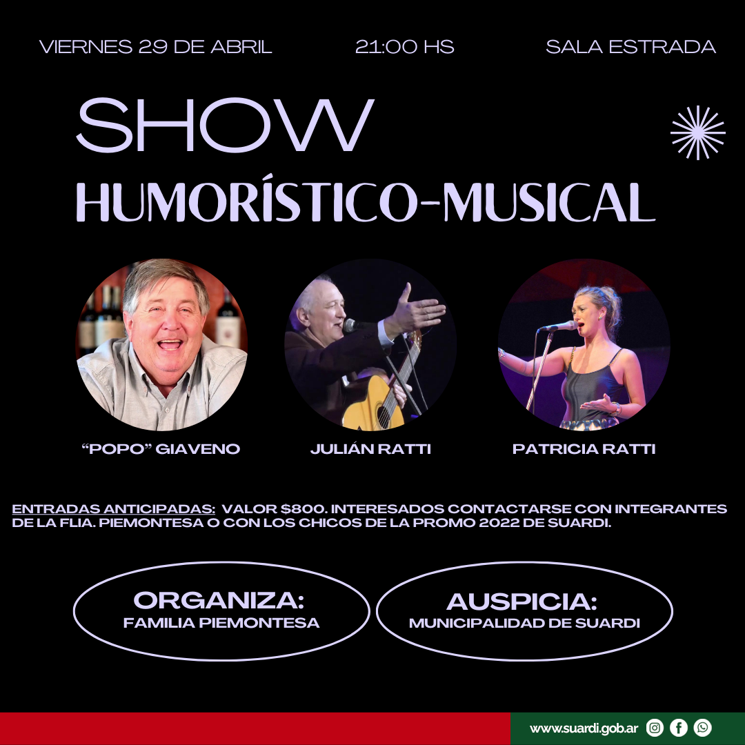 El próximo viernes 29 de abril, se llevará adelante en nuestra ciudad un Show Humorístico-Musical que contará con las actuaciones destacadas del “Popo” Giaveno y Julián y Patricia Ratti.