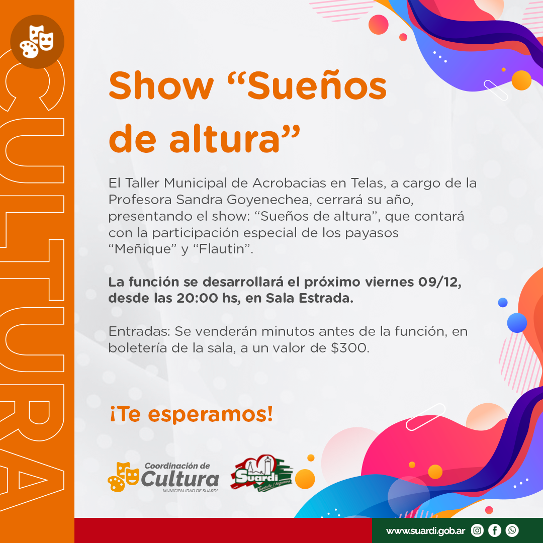 El Taller Municipal de “Acrobacias en Telas, a cargo de la Profesora Sandra Goyenechea, cerrará su año, presentando el show: “Sueños de altura”, que contará con la participación especial de los payasos “Meñique” y “Flautin”.