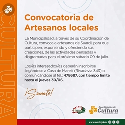 La Municipalidad, a través de su Coordinación de Cultura, convoca a artesanos de Suardi, para que participen, exponiendo y ofreciendo sus creaciones, de las actividades pensadas y diagramadas para el próximo sábado 09 de julio, a realizarse en Plaza «San Martín».