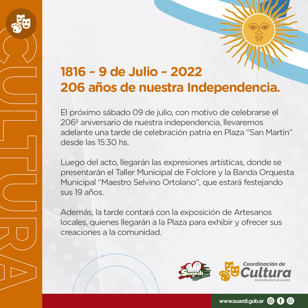 El próximo sábado 09 de julio, con motivo de celebrarse el 206º aniversario de nuestra independencia, llevaremos adelante una tarde celebración patria en Plaza “San Martín”.