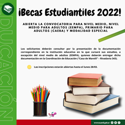 La Dirección de Desarrollo Social y la Coordinación de Educación informan que ya se encuentran abiertas las inscripciones para solicitar las Becas Municipales para Nivel Medio, Nivel Medio para Adultos (EEMPA), Primario para Adultos (CAEBA) y Modalidad Especial.
