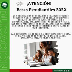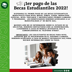 La Coordinación de Educación de la Municipalidad recuerda a los beneficiarios de Becas Municipales 2022, de los niveles Superior (Terciario y Universitario), Capacitaciones, Posgrados y EEMPA, que deben presentar los comprobantes que acrediten el destino de los fondos percibidos hasta el mes de julio inclusive.