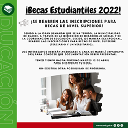 Debido a la gran demanda que se ha tenido, la Municipalidad de Suardi, a través de la Dirección de Desarrollo Social y de la Coordinación de Educación, decide, de manera excepcional, reabrir las inscripciones para becas de Nivel Superior (terciario y universitario).