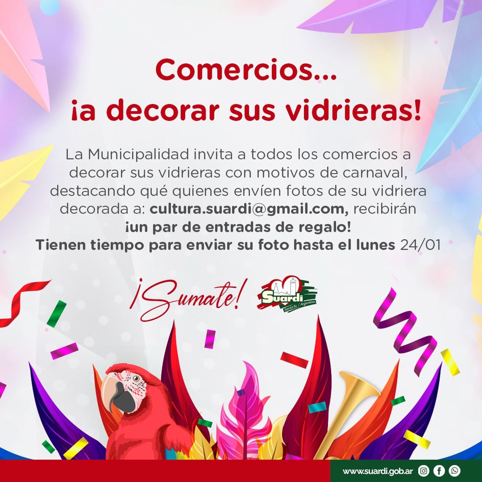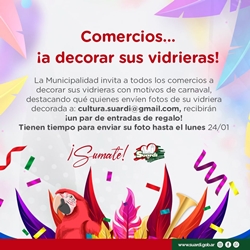 En este marco, días atrás, la Coordinación de Cultura invitó a los comercios locales a decorar sus vidrieras con motivos de carnaval, otorgándole 2 entradas de obsequio a los negocios participantes.