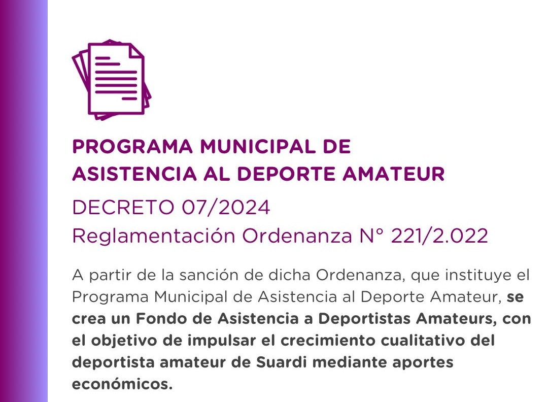 La Coordinación de Deporte del municipio invita al deportista amateur que quiera inscribirse en el Registro único del Deporte Amateur para acceder al programa Municipal de Asistencia, sancionado en la ordenanza N° 221/2.022, que tiene como objetivo otorgar fondos para impulsar el crecimiento cualitativo del deportista amateur de Suardi.