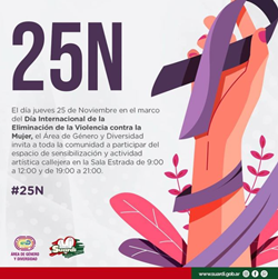 El día jueves 25 de Noviembre, en el marco del Día Internacional de la Eliminación de la Violencia contra la Mujer, el Área de Género y Diversidad invita a toda la comunidad a participar del espacio de sensibilización y actividad artística callejera que se desarrollará en la Sala Estrada, de 09:00 a 12:00 hs y de 19:00 a 21:00 hs.