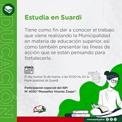 Durante la mañana de este martes 15/03 se desarrolló el Encuentro “Estudiá en Suardi”, el cual tenía como fin dar a conocer el trabajo que viene realizando la Municipalidad en materia de educación superior, así como también presentar las líneas de acción que se están pensando para fortalecerla.