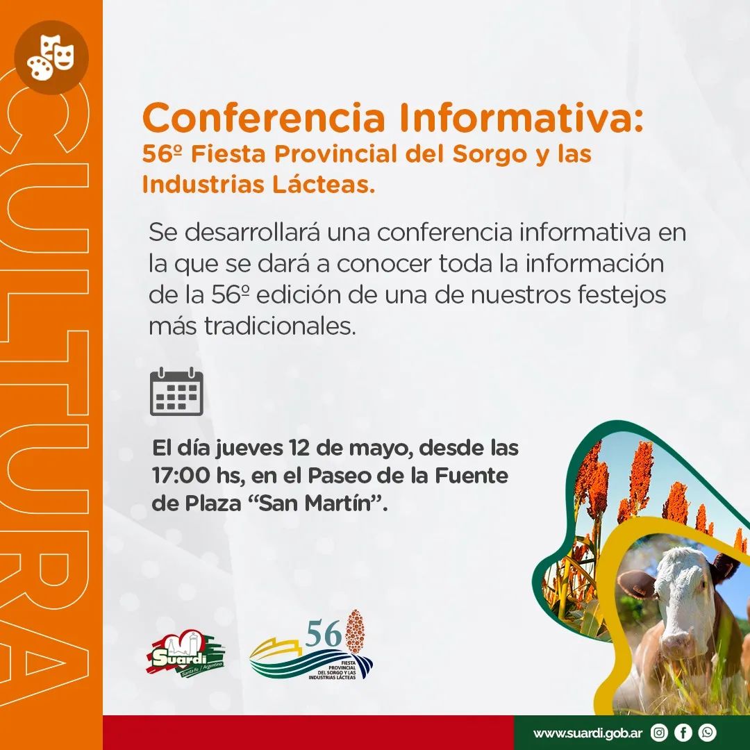 Durante la tarde de este jueves 12/05, se desarrolló en el “Paseo de la Fuente” de Plaza “San Martín”, la Conferencia Informativa donde se anunció toda la información acerca de la 56º Fiesta Provincial del Sorgo y las Industrias Lácteas.
