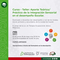 Es importante mencionar que el taller estuvo a cargo de la Lic. en Terapia Ocupacional Jésica Milanesio, y fue destinado a docentes (en desempeño o no) de los niveles inicial, primario, secundario y modalidad especial de nuestra ciudad.