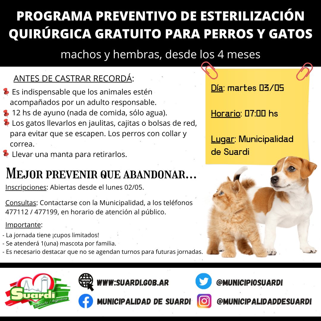 La Municipalidad de Suardi informa que se llevará a cabo el próximo martes 15/03 la esterilización de perros y gatos (machos y hembras) que tengan más de 4 meses de vida, de forma totalmente gratuita. Dicha acción tendrá lugar en la Municipalidad (1° de Mayo 364), a partir de las 07:00 hs.