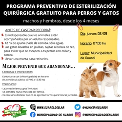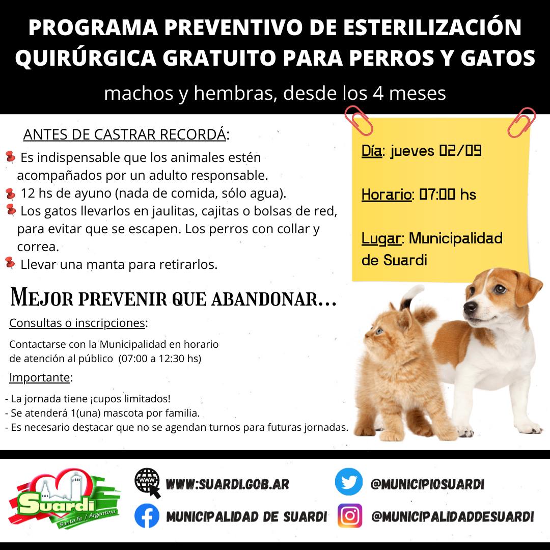 La Municipalidad de Suardi informa que se llevará a cabo el próximo jueves 02/09 la esterilización de perros y gatos (machos y hembras) que tengan más de 4 meses de vida, de forma totalmente gratuita.