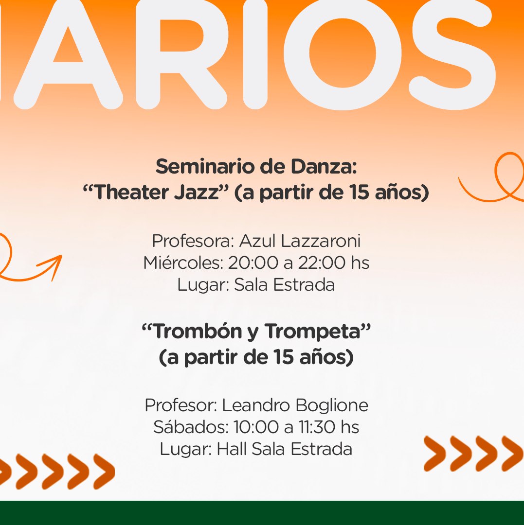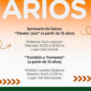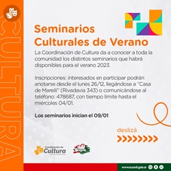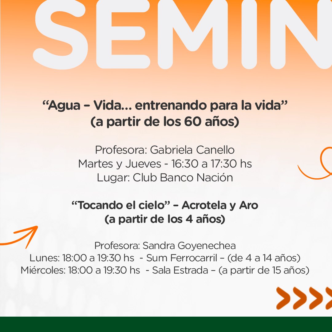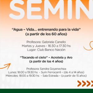 Para este verano 2023, la oferta de seminarios fue variada, ya que hubo posibilidades de todas las ramas y para todas las edades. Los seminarios fueron: “Agua – Vida… entrenando para la vida”, “Tocando el cielo” – Acrotela y Aro, Seminario de Danza: “Theater Jazz”, “Folclore”, “Seminario de Zamba”, “Yo Creo”… Pintura y masas, y Proyecto “Mural Cerámico”.