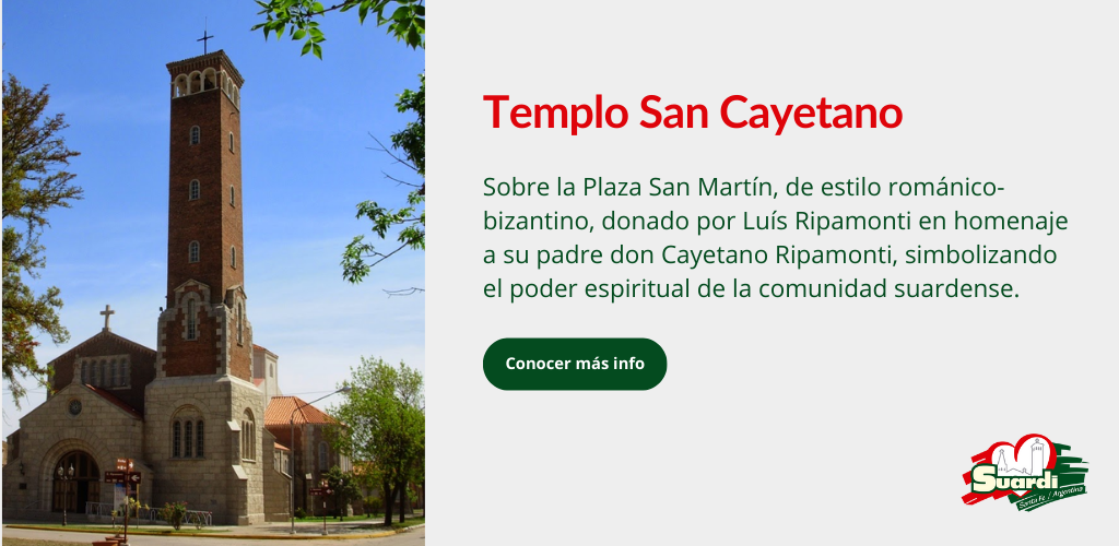 Sobre la Plaza San Martín, de estilo románico-bizantino, donado por Luís Ripamonti en homenaje a su padre don Cayetano Ripamonti, simbolizando el poder espiritual de la comunidad suardense. Esta obra se inició el 13 de junio de 1936 bajo el proyecto y dirección del ingeniero Alulla Baldasarini, el cual se basó en los planos de la iglesia de Mangnet, Italia, que habían sido adquiridos por don Luis Ripamonti. La ejecución demandó varios años, siendo inaugurado el 24 de marzo de 1957, ocasión en la cual estaban presentes Monseñor Nicolás Fasolino, Arzobispo de Santa Fe, y doña Blanca del Prete de Ripamonti, donante del templo.