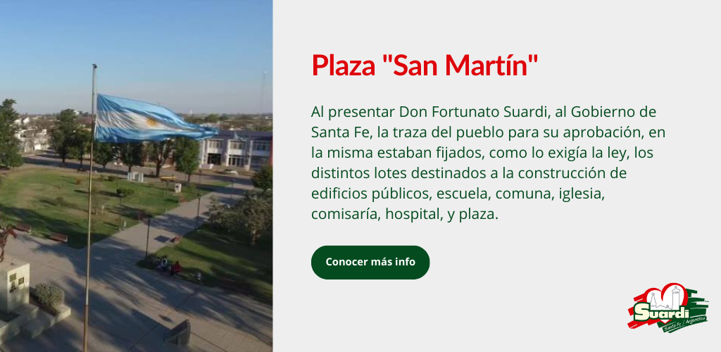 Años más tarde, y luego de diversos trabajos de remodelación, en el año 1950, como motivo de cumplirse el primer centenario del fallecimiento del Gral. José de San Martín, el Gobierno Nacional lo declaró como el “Año del Libertador Gral. San Martín”, y se dispuso que todos los pueblos y ciudades del país debían nombrar una de las plazas públicas existentes con su nombre. En Suardi se da cumplimiento a la disposición y se construye un monumento con el busto del prócer.