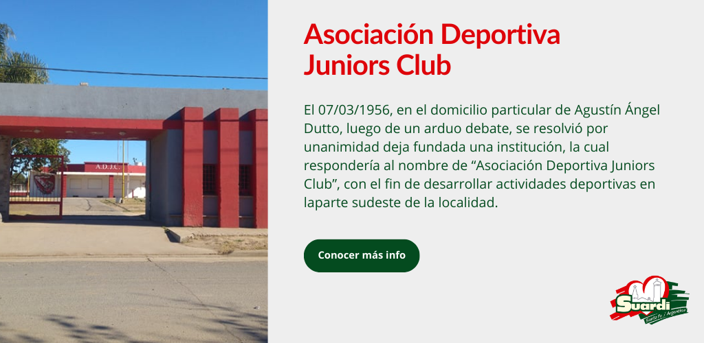 El 07/03/1956, en el domicilio particular de Agustín Ángel Dutto, luego de un arduo debate, se resolvió por unanimidad deja fundada una institución, la cual respondería al nombre de “Asociación Deportiva Juniors Club”, con el fin de desarrollar actividades deportivas en laparte sudeste de la localidad. El primer presidente del Club fue Domingo Baima.